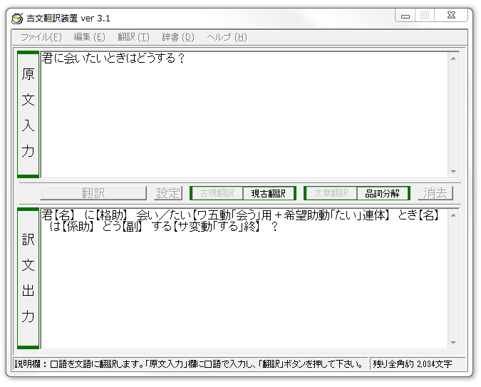 例は現代文→古文の現古翻訳ですが、古文→現代文の古現翻訳でも同様の処理が可能です。